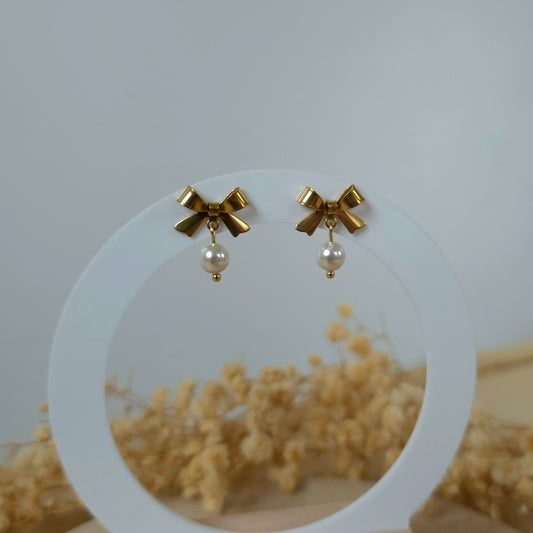 Golden bow and pearl earrings