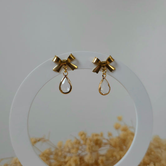 Golden bow and mini clear drop earrings