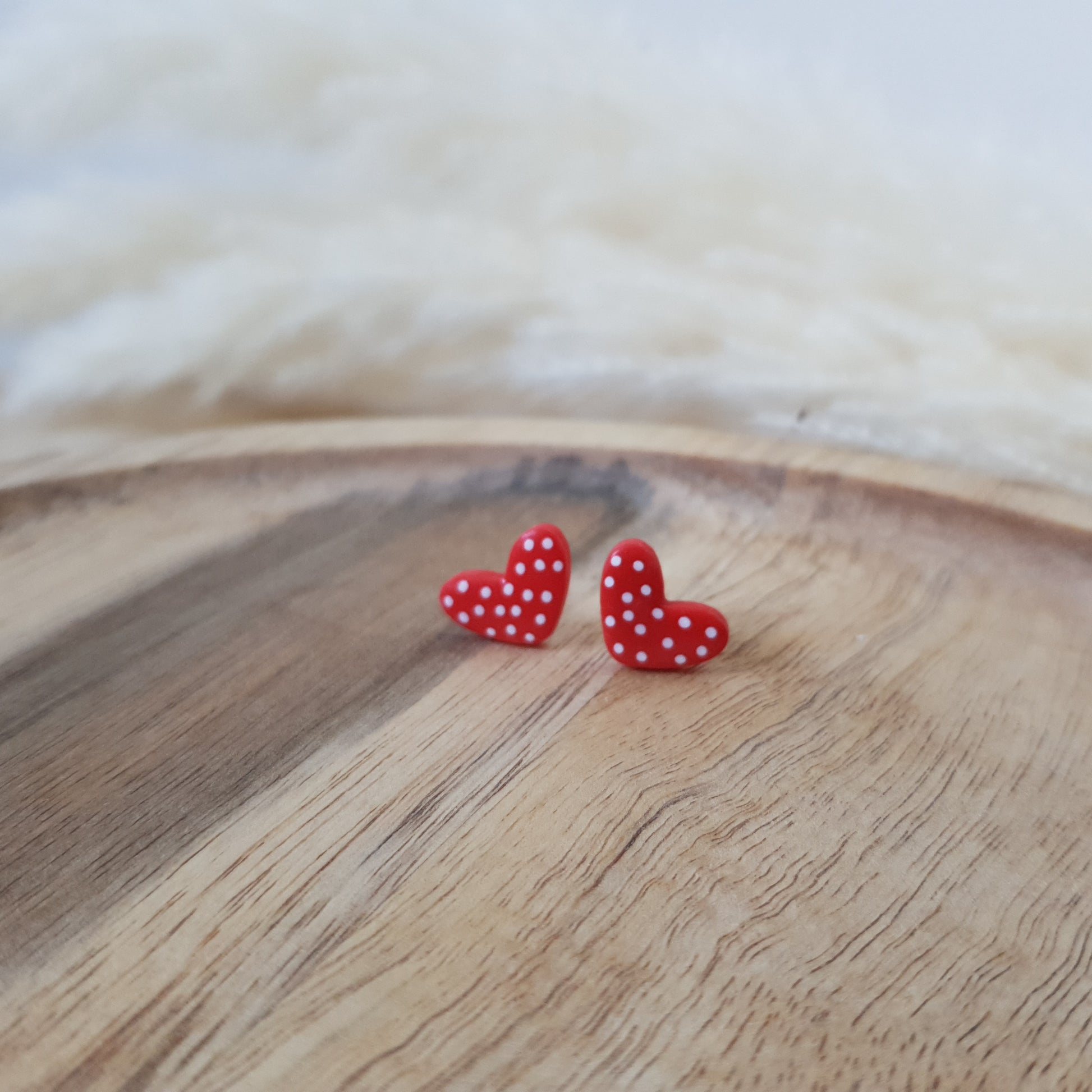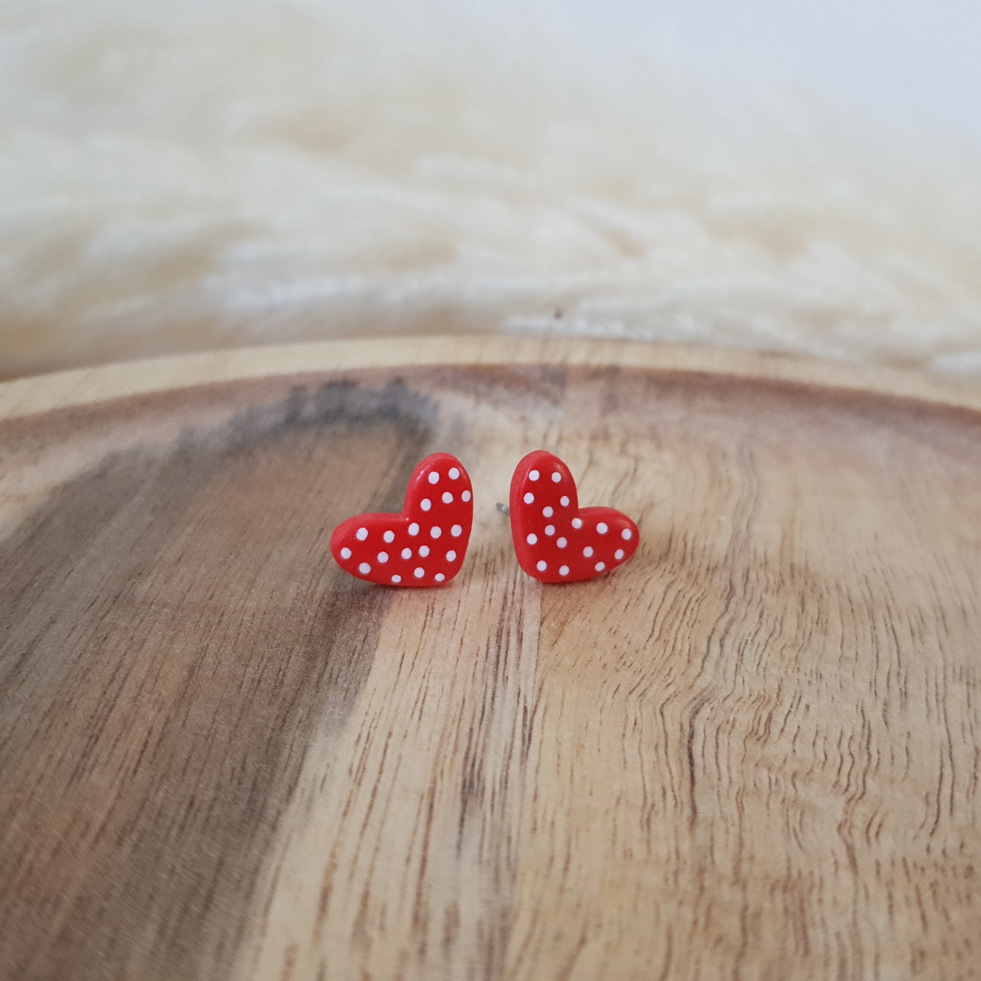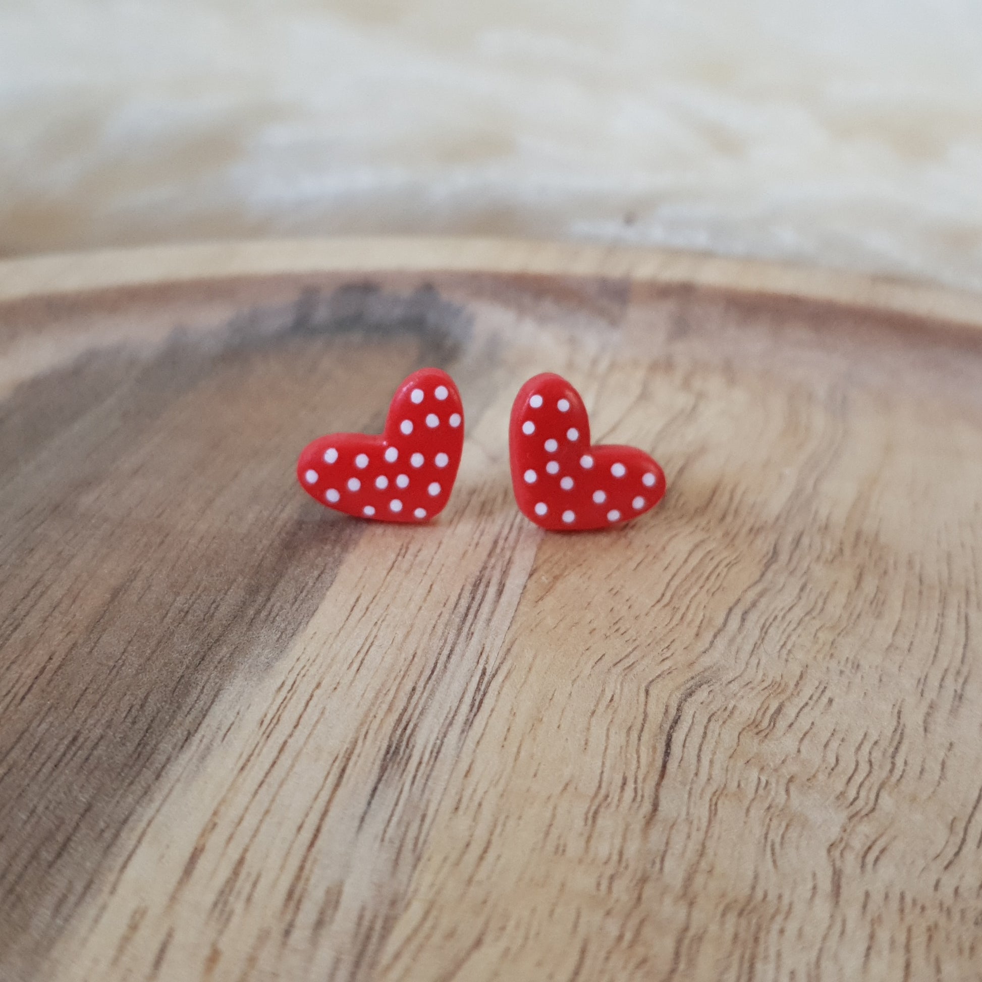 Handmade spotted heart stud earrings.