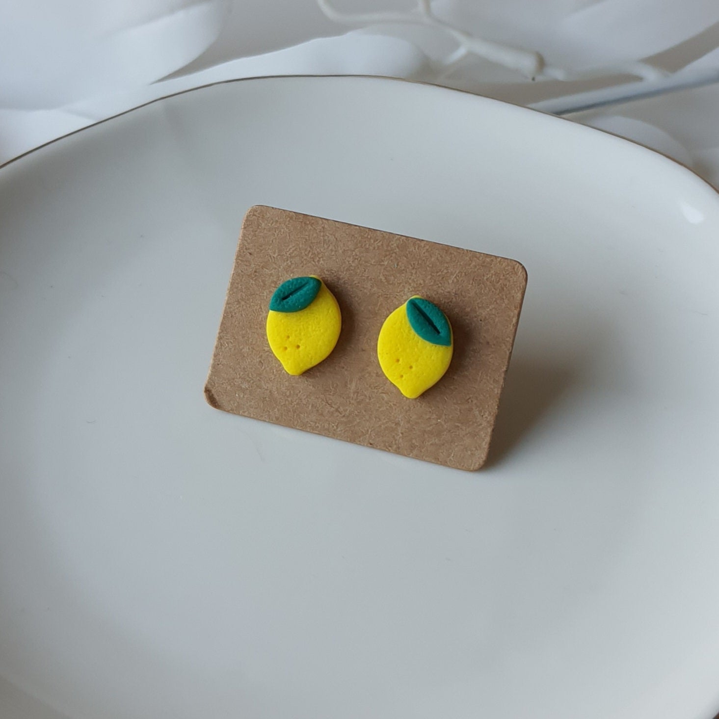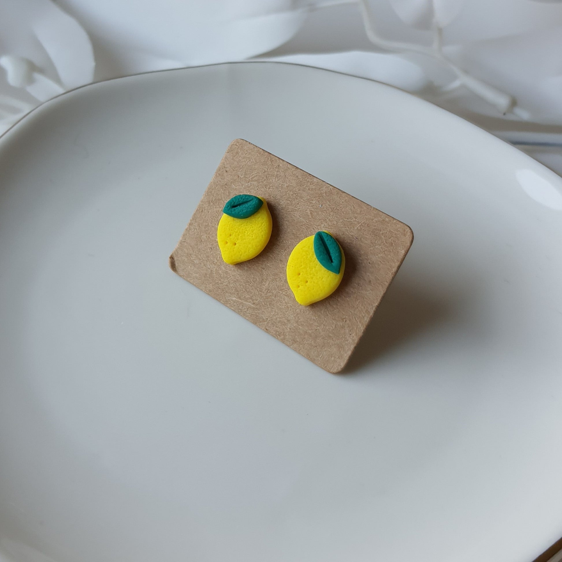 Handmade lemon stud earrings.