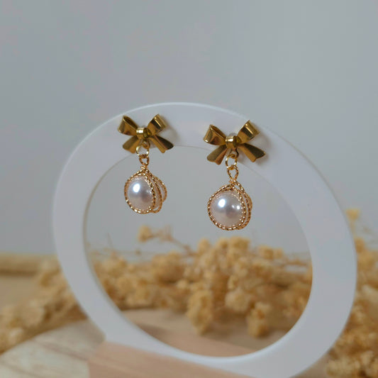 Golden bow and pearl earrings